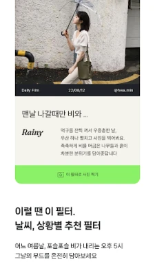 filmhwa (필름화) nudi ekskluzivne filtere inspirisane estetikom influenserke 화민. U jednom trenutku, vaše fotografije dobijaju autentičan filmski izgled. Oživite uspomene prirodnim bojama i toplim nijansama, bilo da slikate prirodu ili svakodnevne scene. Otkrijte jedinstvene filtere za svaku priliku, kreirane lično od 화민.