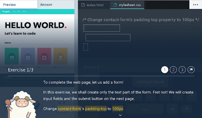 Kroz jedinstven sistem nivoa, Progate transformiše sticanje veština u zabavnu avanturu, podstičući vaš napredak sa svakim rešenim zadatkom. Naše pažljivo dizajnirane, vizuelno bogate slajd prezentacije omogućavaju vam intuitivno razumevanje materijala, omogućavajući učenje sopstvenim tempom. Nakon usvajanja teorije, odmah prelazite na interaktivne vežbe gde praktično primenjujete naučeno, uz trenutnu povratnu informaciju o ispravnosti vašeg koda. Ovaj praktičan pristup osigurava duboko razumevanje funkcionisanja programa.