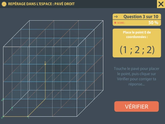 Za one spremne za napredniji izazov, Repérage nudi i vežbe snalaženja u prostoru. Istražite tri fascinantna scenarija: rad sa kvadrom, razumevanje naslaganih kubova i snalaženje na globusu. I ovde je moguće podesiti broj pitanja (od 5 do 20) kako bi se dinamika učenja prilagodila vašem tempu. Posebno, za vežbe sa kvadrom, možete birati između očitavanja koordinata tačke i postavljanja tačke sa poznatim koordinatama. Za preostale dve prostorne vežbe, fokus je na očitavanju koordinata. Repérage takođe podržava sistem scanScores (verzija 1.0.2 ili novija), što omogućava napredno praćenje i analizu vašeg napretka, čineći ga nezaobilaznim alatom za učenje i procenu znanja.